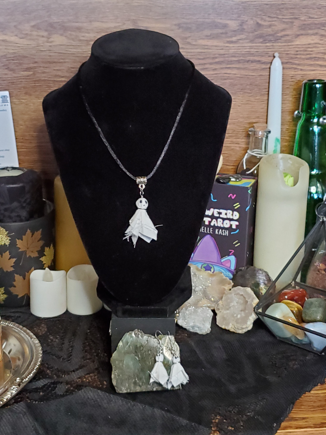 A fun, casual corded necklace with a handcrafted fabric ghost pendant. Each ghost is handcrafted and therefore unique! This set comes with a matching pair of fabric ghost earrings with silver-plated fish hooks. Perfect for Halloween or that special spooky someone in your life.