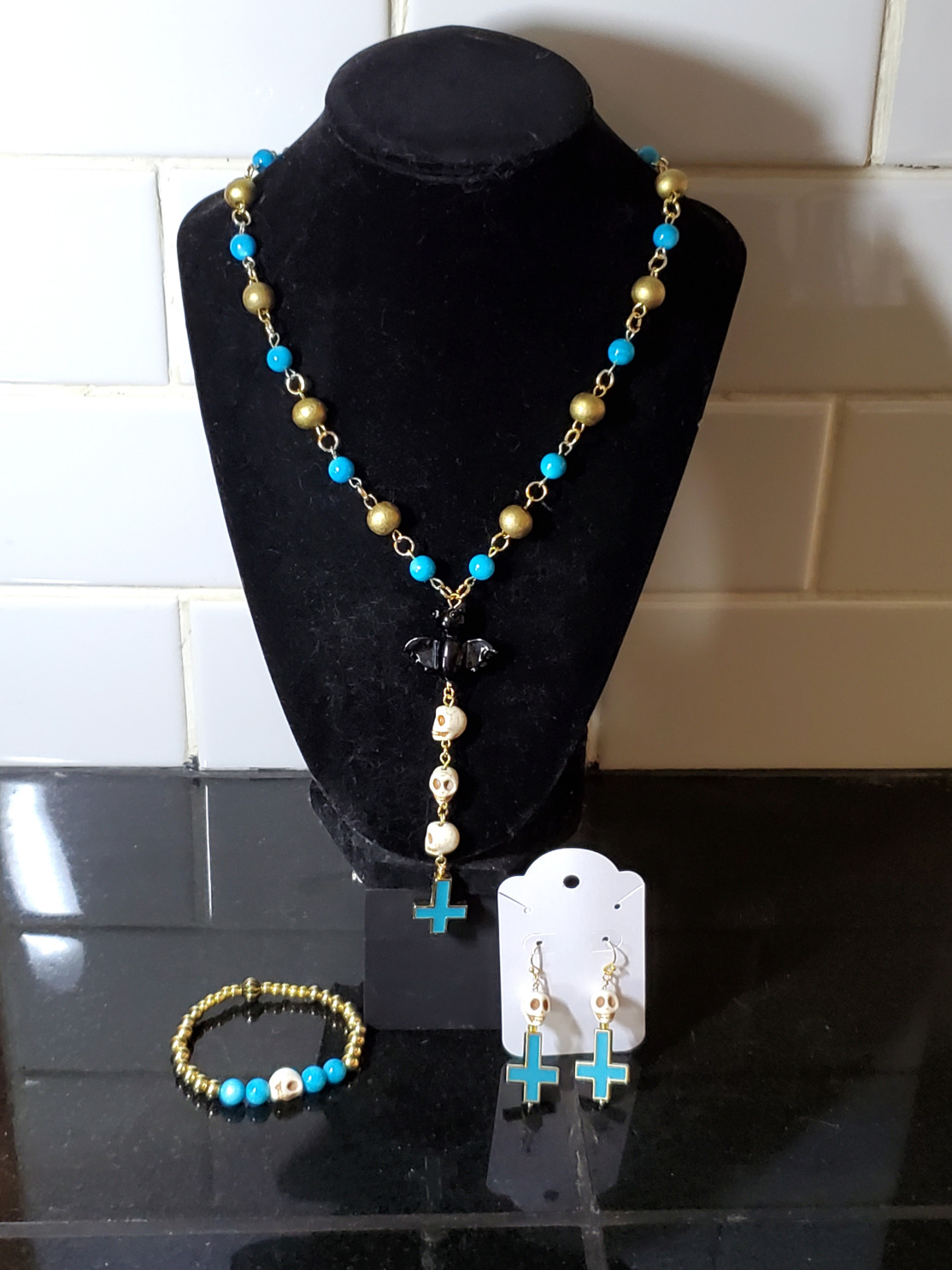 This rosary style necklace is handcrafted with gold painted wooden rounds and blue shell rounds. The focal of the rosary is a lampwork glass bat followed by three howlite carved skull beads and a gold plated and blue enamel cross pendant. The matching bracelet includes a skull bead focal surrounded by blue shell beads. The earrings are a full statement piece, with nickel-free fish hooks, carved skulls, and enamel crosses.
