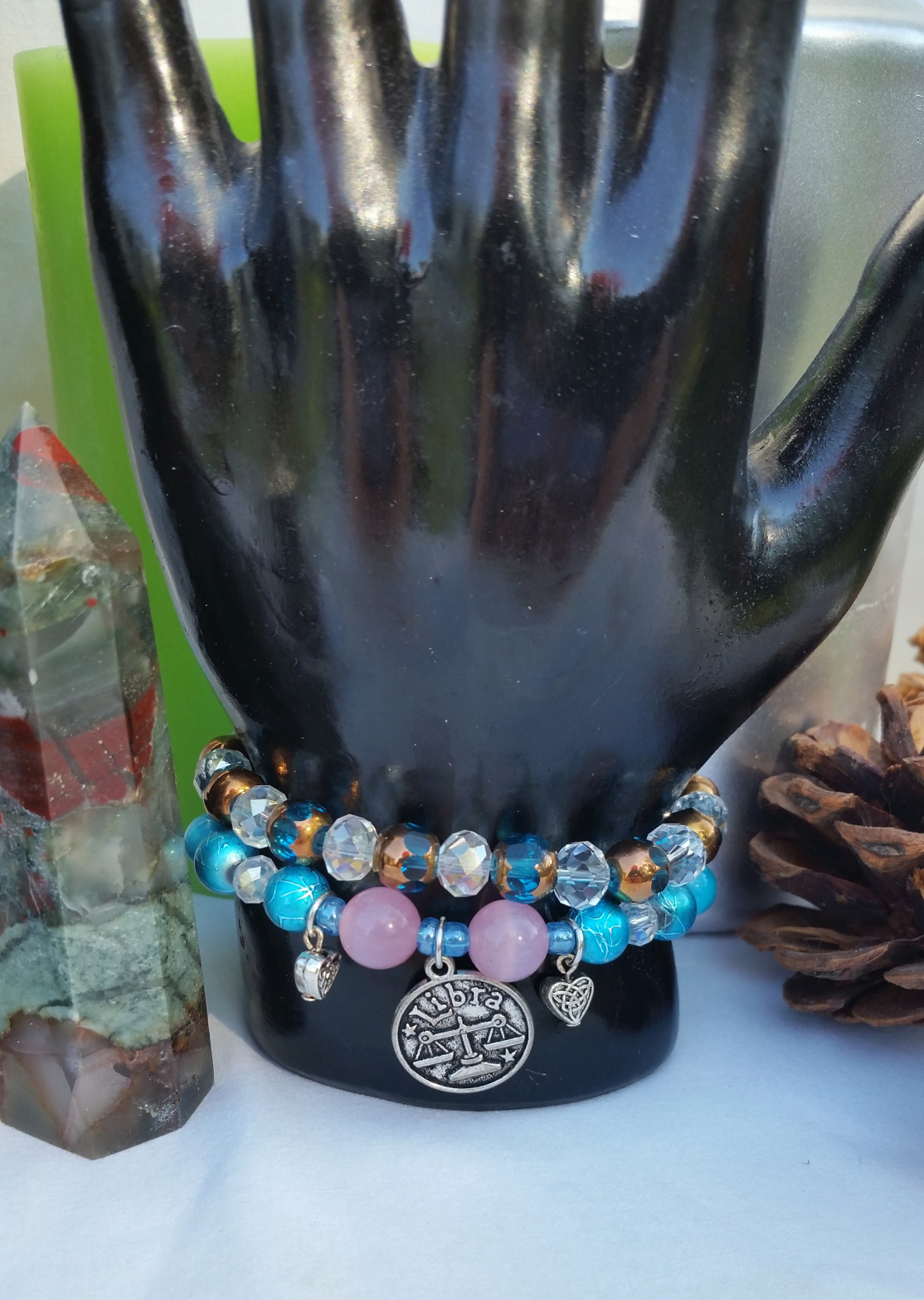Two Libra themed stretch bracelets and earring set. This set comes with two stretch bracelets both using the colours associated with Libra. Both bracelets feature faceted glass beads. One bracelet features two pink cat's eye rounds, a silver plated Libra zodiac coin charm, and 2 celtic knot work hearts. The Earrings are silver plated nickel-free fish hooks with matching beads. Wear the bracelets together or seperately!