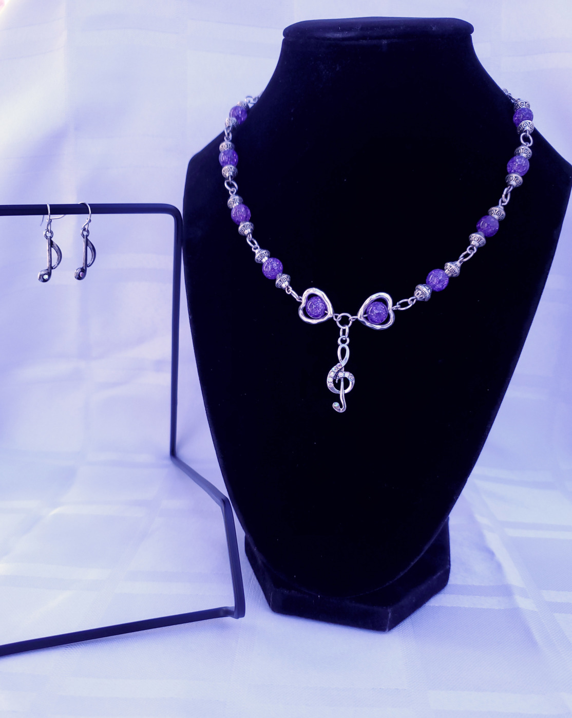 This necklace and earrings set would make a perfect gift for any musical performer in your life. All findings are nickel-free. The beaded necklace features silver plated carved metal bicone beads and silver plated heart frames. Each encase purple crackle glass rounds. A trebel cleff pendant with eye catching rhinestones makes a subtle statement. The matching earrings feature eighth note charms each with a single rhinestone ready to catch the light and dazzle the crowd.